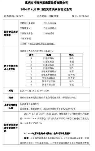 投資者關心,2024年原料收購成本降低,全年毛利率展望?涪陵榨菜回復:公司每年青菜頭收購后將在當年5、6月份逐步投入使用,原料成本將在每年下半年逐步體現(xiàn),上半年營業(yè)成本取決于上年度青菜頭收購價格,青菜頭收購價去年同期約為1100元/噸,全年整體來看原料收購價格降低對毛利率影響不大。