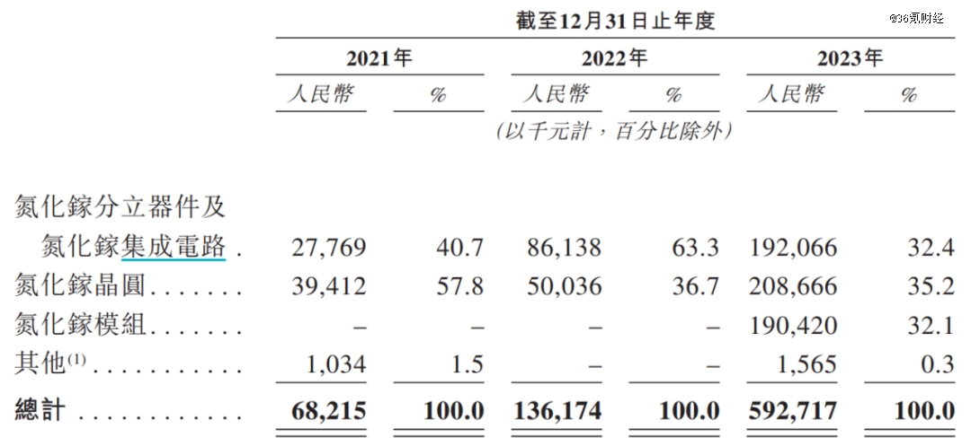 產(chǎn)品構(gòu)成方面,2023年英諾賽科晶圓、分立器件+集成電路、模組的營業(yè)收入分別為2.09、1.92、1.90億元,三個(gè)產(chǎn)品的營收分布比較均衡。值得注意的是,2022年及以前,英諾賽科并沒有模組收入,2023年公司模組收入激增則是因?yàn)橄驅(qū)幍聲r(shí)代供貨。