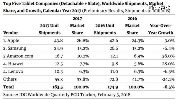 到2017年時(shí),智能手機(jī)大屏化、筆記本電腦超輕超薄化導(dǎo)致平板被冷落——盡管iPad不斷遭到市場(chǎng)研究機(jī)構(gòu)唱衰,但依舊牢牢占據(jù)頭把交椅,超過第二三星和第三亞馬遜出貨量總和。