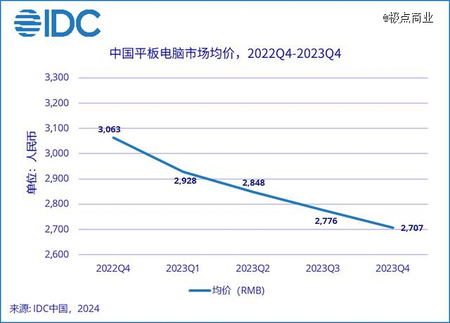 中國(guó)平板電腦市場(chǎng)均價(jià)目前正處于一路下滑的情況,從 2022 年第四季度的 3063 元,下滑到 2023年第四季度的2707 元。對(duì)蘋果來說,*問題是產(chǎn)品線不合理——蘋果iPad產(chǎn)品線較為混亂,且扎堆中高端,目前在售平板產(chǎn)品中,價(jià)格*的第九代iPad售價(jià)2599元起,但只有64G。這是國(guó)產(chǎn)平板競(jìng)爭(zhēng)最為激烈的區(qū)間,蘋果沒有明顯競(jìng)爭(zhēng)優(yōu)勢(shì)。