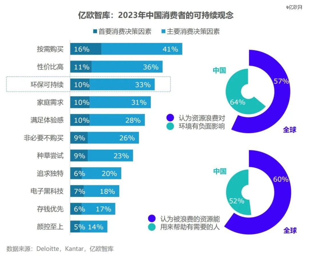 億歐智庫調(diào)研發(fā)現(xiàn),2023年,“環(huán)??沙掷m(xù)”成為消費者們的主要消費決策因素之一。進入理性消費的時代,消費者在購買行為中獲得安全感的需求遠高于沖動消費時產(chǎn)生的多巴胺。可持續(xù)消費所體現(xiàn)的對于安穩(wěn)、安全、長遠、美好的追求是對消費者社會情感訴求的反射。