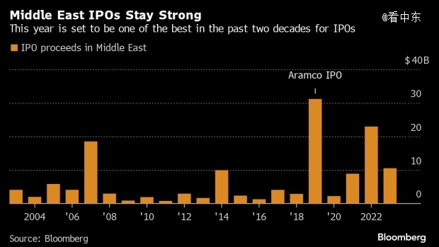 過去兩年,這個能源豐富的地區(qū)已成為繁忙的IPO市場,因為各國政府打算在原油價格居高不下的情況下出售其國有企業(yè)的股份,以擺脫對石油的依賴。盡管融資額低于去年,但 105 億美元的 IPO 收益已經(jīng)創(chuàng)下了第三高的年份。2023年,海灣地區(qū)已經(jīng)占領(lǐng)了歐洲、中東和非洲 IPO 總量的 45%。
