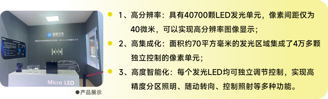 智能汽車時(shí)代需要更多智能交互的功能,除了車內(nèi)交互之外,車輛與外部交互也將由燈光系統(tǒng)承擔(dān)。國(guó)星光電開(kāi)發(fā)出的萬(wàn)級(jí)像素智能化大燈Micro LED光源,通過(guò)采用共晶鍵合技術(shù)將微米級(jí)Micro LED藍(lán)光芯片陣列整合集成到CMOS控制電路上,實(shí)現(xiàn)Micro LED陣列中單個(gè)像素獨(dú)立控制,搭配高光效白光轉(zhuǎn)換介質(zhì),可實(shí)現(xiàn)萬(wàn)級(jí)像素高品質(zhì)圖像顯示。