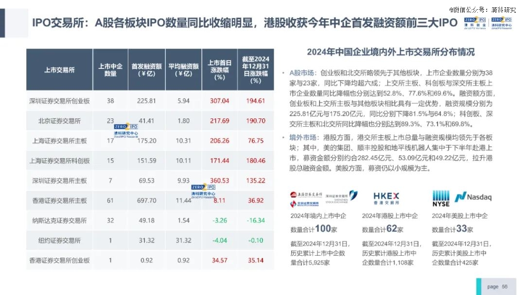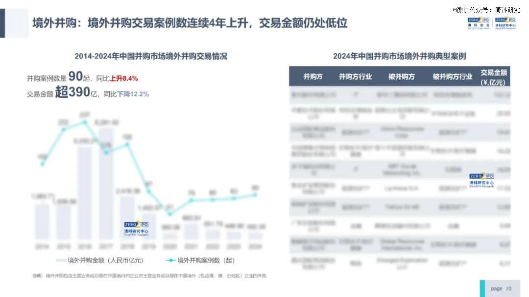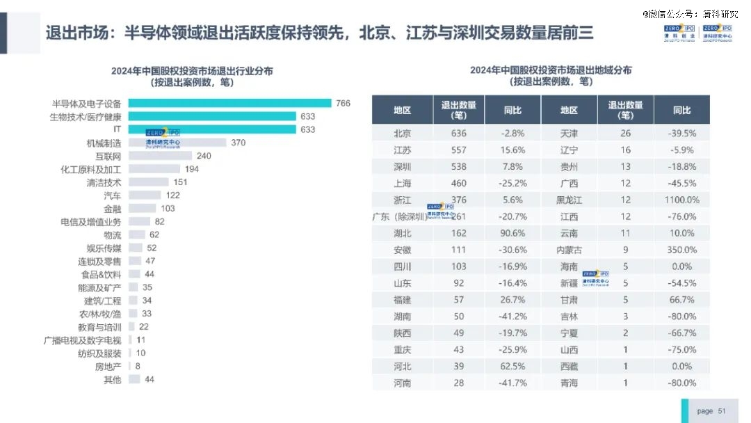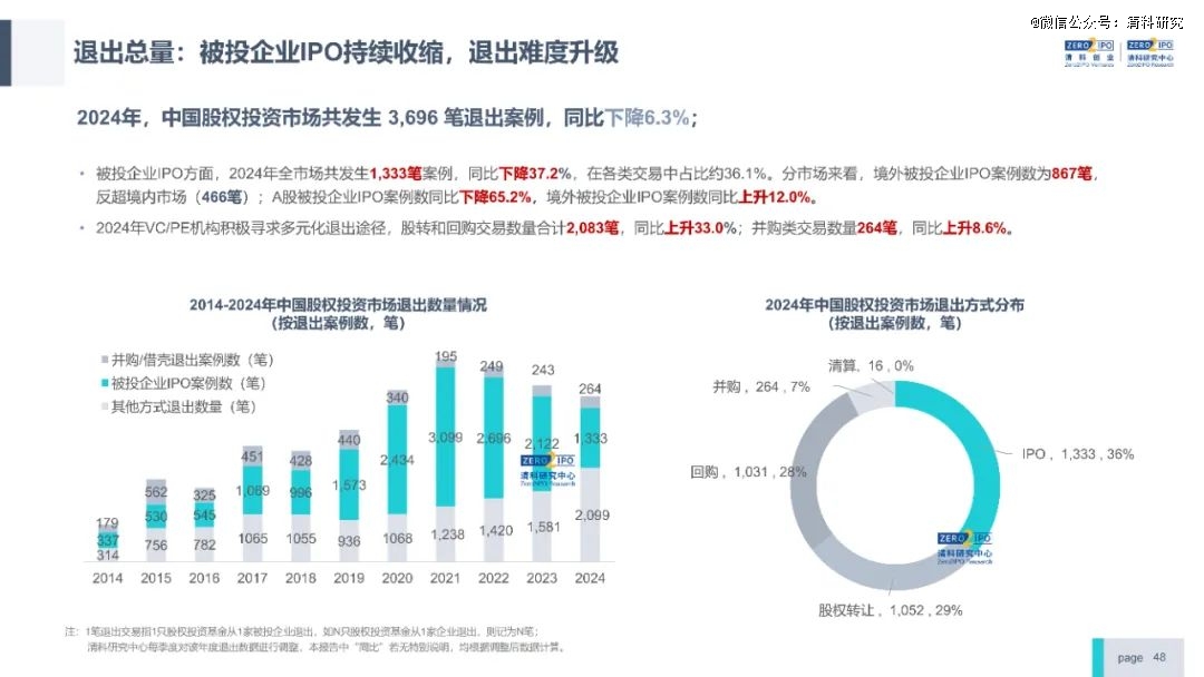 退出方面,2024年共發(fā)生3,696筆退出案例,同比下降6.3%,其中被投企業(yè)IPO案例數(shù)為1,333筆,占比36.1%。值得注意的是,2024年境外被投企業(yè)IPO案例數(shù)為達(dá)到867筆,同比上升12.0%,中企境外市場(chǎng)IPO逐步回暖。