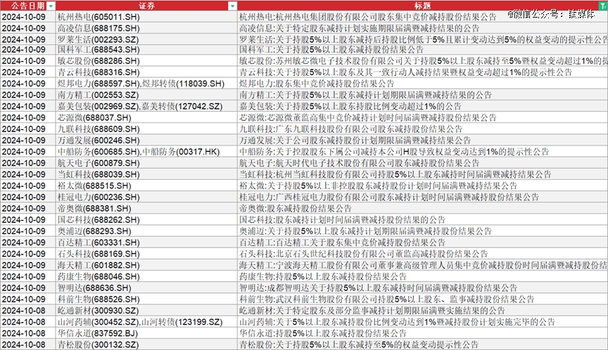 但也有公司高管呈現(xiàn)出集體減持,例如揚帆新材(300637.SZ)公告稱,2024 年 7 月 30 日至 2024 年 10 月 8 日期間,劉輝、樊相東、朱俊飛、陶明和上官云明分別通過集中競價交易方式進(jìn)行減持,合計減持比例為0.05%。