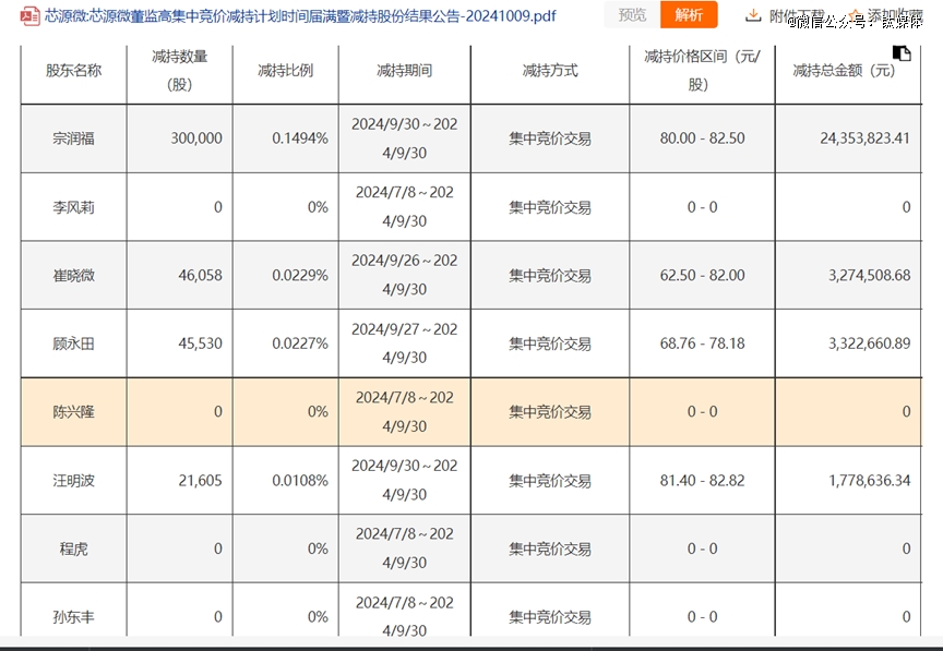 例如,芯源微(688037.SH)公告稱,宗潤福通過集中競價交易方式合計已減持股份數(shù)量30萬股,約占當(dāng)前公司總股本的0.1494%;顧永田通過集中競價交易方式合計已減持股份數(shù)量45530股,約占當(dāng)前公司總股本的0.0227%;汪明波通過集中競價交易方式合計已減持股份數(shù)量21605股,約占當(dāng)前公司總股本的0.0108%。
