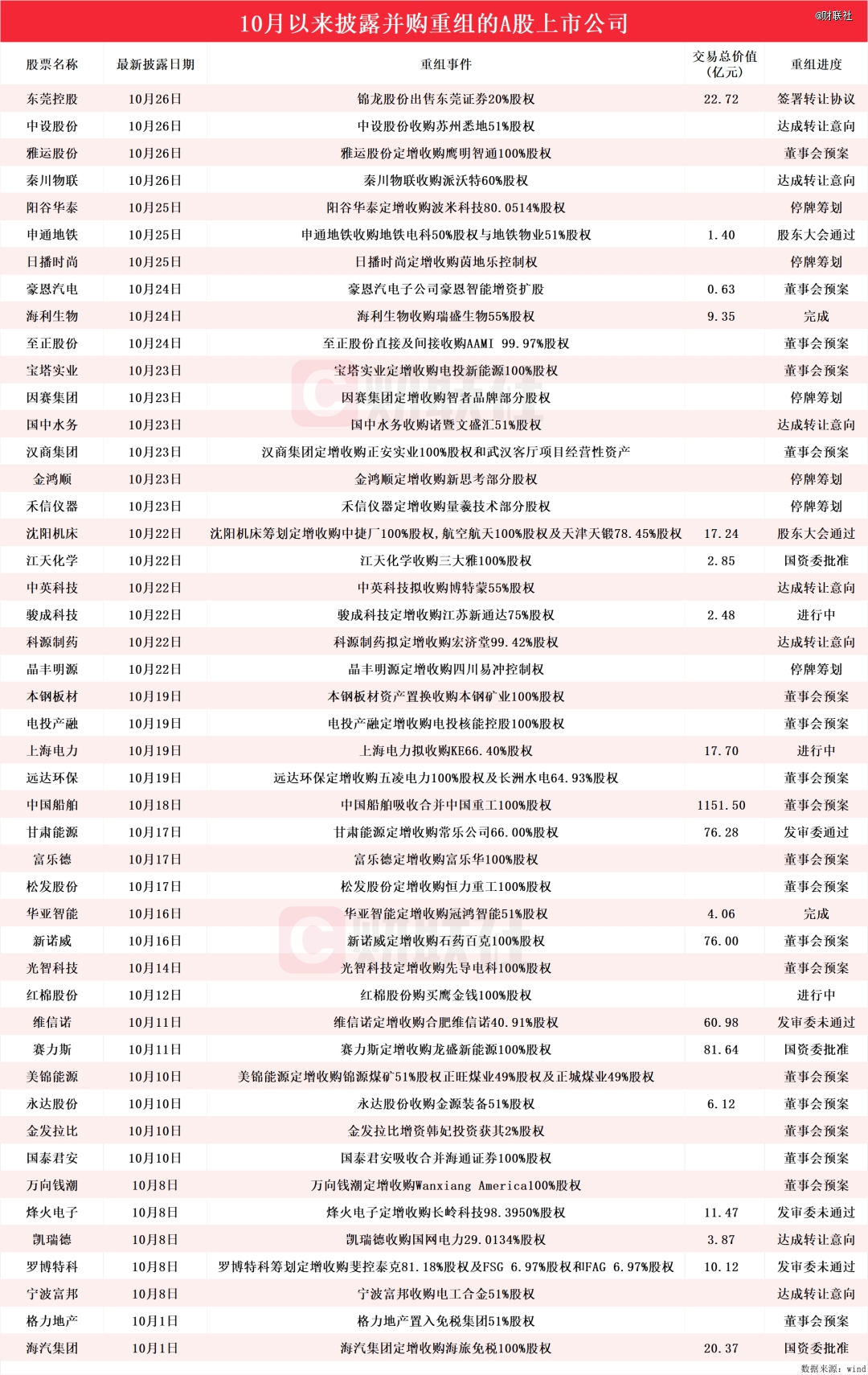 據(jù)Wind數(shù)據(jù)統(tǒng)計(jì),剔除重組失敗、出讓方、ST股,10月以來披露并購(gòu)重組進(jìn)展的A股上市公司共有47家,分別為東莞控股、中設(shè)股份、雅運(yùn)股份、秦川物聯(lián)、陽谷華泰、申通地鐵、日播時(shí)尚、豪恩汽電、海利生物、至正股份、寶塔實(shí)業(yè)、因賽集團(tuán)、國(guó)中水務(wù)、漢商集團(tuán)、金鴻順、禾信儀器、沈陽機(jī)床、江天化學(xué)、中英科技、駿成科技、科源制藥、晶豐明源、本鋼板材、電投產(chǎn)融、上海電力、遠(yuǎn)達(dá)環(huán)保、中國(guó)船舶、甘肅能源、富樂德、松發(fā)股份、華亞智能、新諾威、光智科技、紅棉股份、維信諾、賽力斯、美錦能源、永達(dá)股份、金發(fā)拉比、國(guó)泰君安、萬向錢潮、烽火電子、凱瑞德、羅博特科、寧波富邦、格力地產(chǎn)和海汽集團(tuán)。具體情況如下圖:
