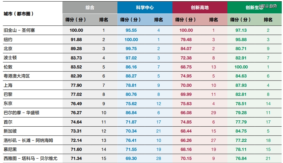 國際科技創(chuàng)新中心綜合排名前15名(2024)