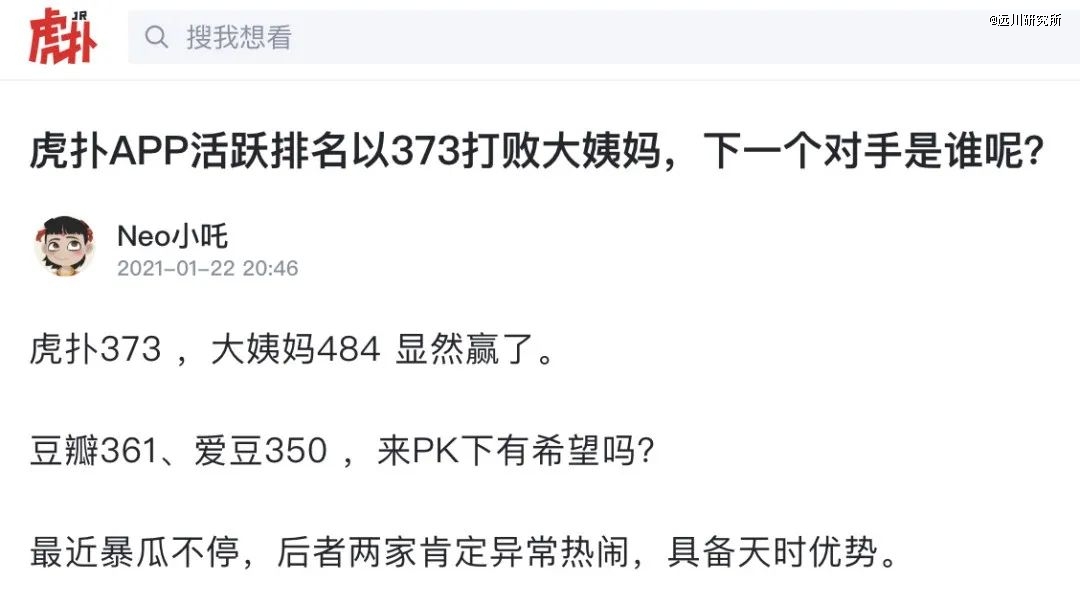 三年后,虎撲月活縮水得不足十分之一,同在一份APP活躍度榜單上,高攀不上破億的小紅書,競爭不過700多萬的豆瓣,對標(biāo)對象慘遭消費降級,變成一款叫“大姨媽月經(jīng)期助手”的APP[9]。