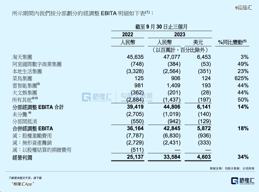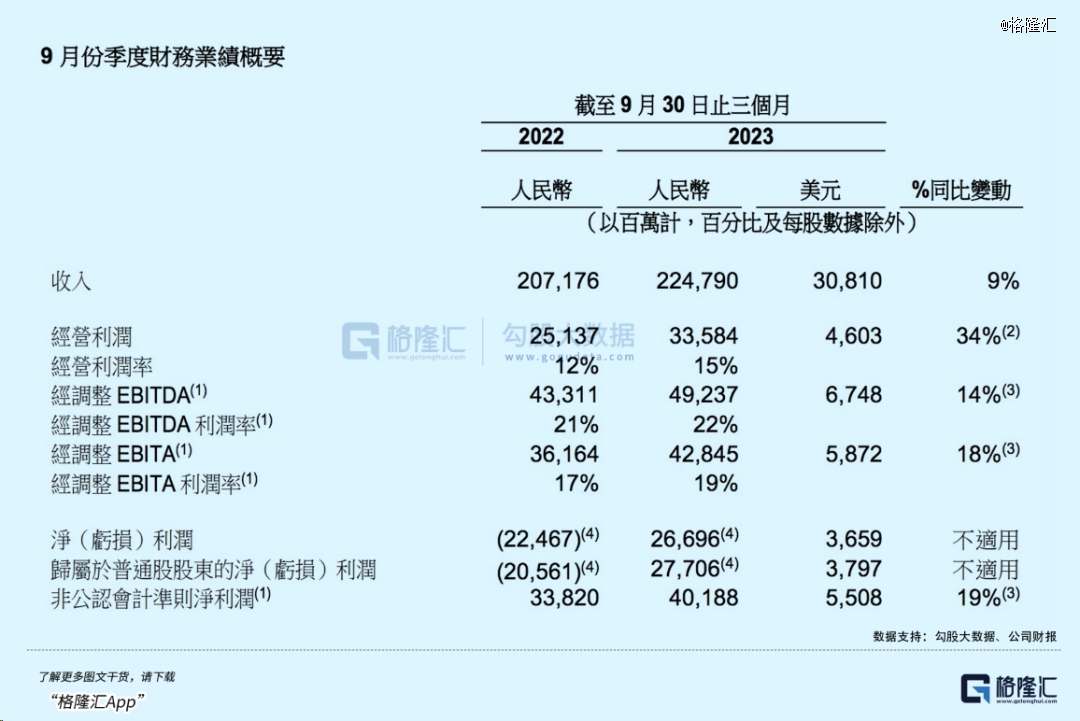 財(cái)報(bào)數(shù)據(jù)顯示,該季度實(shí)現(xiàn)營收2247.9億元人民幣,同比增長9%;經(jīng)營利潤335.84億元,同比增長34%;調(diào)整后EBITDA 492.4億元,同比增長14%;調(diào)整后凈利潤401.9億元,同比增長19%。