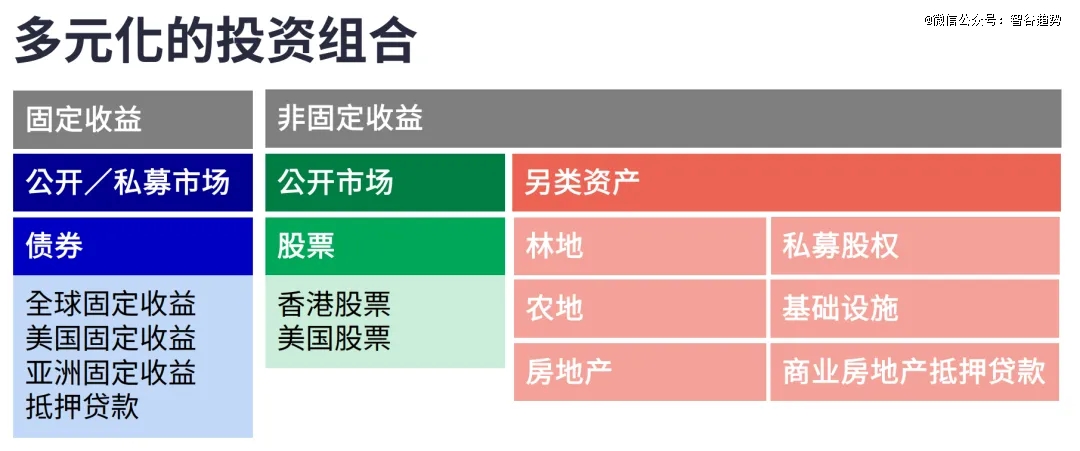 下圖選取了某家香港保險(xiǎn)公司的投資圖,也是多元化的投資組合,投資范圍遍布全球各大洲,產(chǎn)品包括了海外股票、債券在內(nèi)的類別,連普通人難以觸及的林地、農(nóng)地項(xiàng)目都有涉獵。