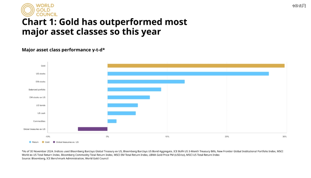 2024年,在美聯(lián)儲降息預(yù)期提升、地緣政治風(fēng)險不斷發(fā)酵,以及美國大選帶來的政策不確定性的影響下,國際金價30多次創(chuàng)出新高。截至2024年年底,倫敦現(xiàn)貨黃金定盤價為2609.1美元/盎司,較年初的2074.90美元/盎司上漲25.75%,其收益表現(xiàn)優(yōu)于美國股票、新興市場股票等其他主要資產(chǎn)。