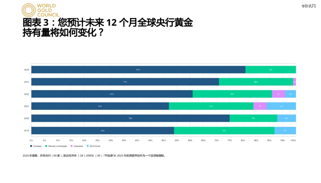 對于未來央行能否保持增持黃金的熱情,世界黃金協(xié)會在2024年央行黃金儲備調(diào)查報告中指出,通過梳理70份有效調(diào)查回復(fù),有29%的央行受訪者計劃在未來12個月內(nèi)增加黃金儲備,而這一比例是2018年開始此項調(diào)查以來的最高水平。同時這份報告還指出,有81%的央行受訪者認為未來12個月全球各國央行黃金持有量將進一步增加。
