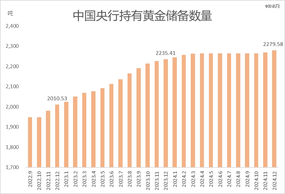 1月7日,我國央行公布了新一期官方儲備資產(chǎn)數(shù)據(jù),截至2024年末,我國央行持有黃金儲備2279.58噸,全年增持44.17噸,這是其連續(xù)第三年增持黃金。其中我國央行在2023年增持黃金224.88噸,居于當(dāng)年全球各國央行增持黃金數(shù)量首位。