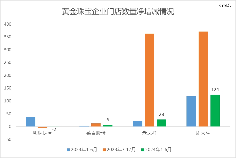 從黃金珠寶上市企業(yè)的財報獲悉,截至2024年6月末,菜百股份擁有93 家直營連鎖門店,較年初凈增加6家,增加數(shù)量不及2023年下半年的13家,而同期老鳳祥的銷售網(wǎng)點增加了28家,與2023年下半年的363家相差甚遠。此外,明牌珠寶的門店數(shù)量在去年上半年凈減少了2家。