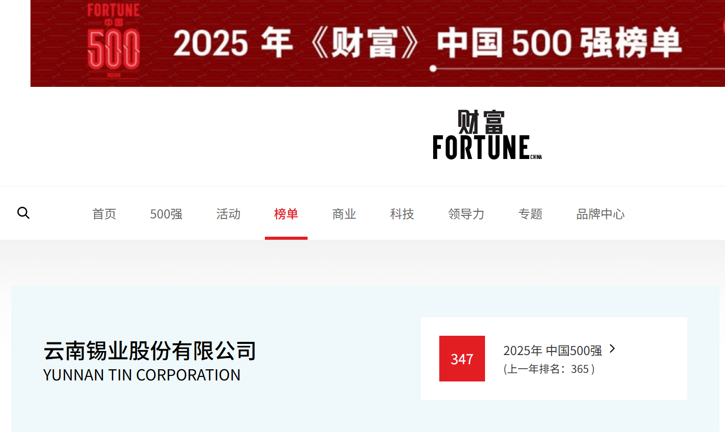 7月22日,2025年《財(cái)富》中國500強(qiáng)排行榜發(fā)布,錫業(yè)股份(000960)位居第347位,較去年排名上升18位。