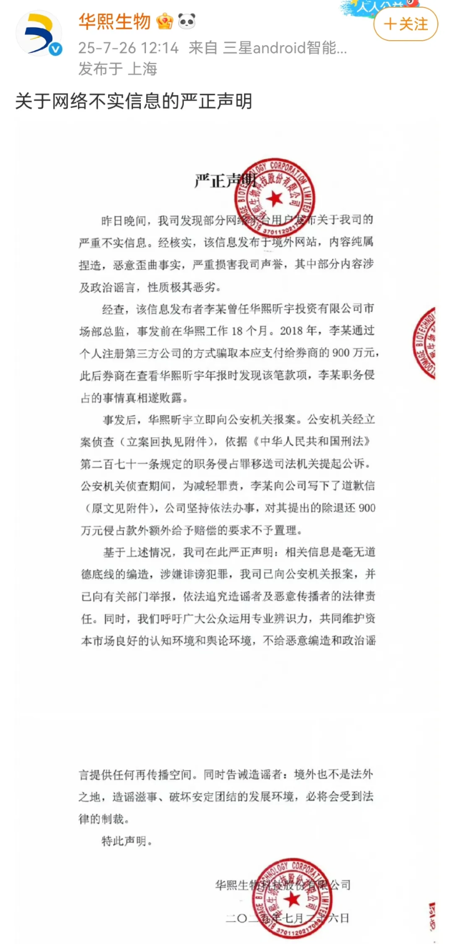 7月26日,華熙生物官方微博發(fā)布《關(guān)于網(wǎng)絡(luò)不實(shí)信息的嚴(yán)正聲明》稱,昨日晚間發(fā)現(xiàn)部分網(wǎng)絡(luò)平臺(tái)用戶發(fā)布關(guān)于公司的嚴(yán)重不實(shí)信息。經(jīng)核實(shí),信息發(fā)布于境外網(wǎng)站,內(nèi)容純屬捏造。