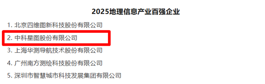 近日,中國(guó)地理信息產(chǎn)業(yè)協(xié)會(huì)發(fā)布了2025地理信息產(chǎn)業(yè)百?gòu)?qiáng)企業(yè)、最具活力中小企業(yè)、最具成長(zhǎng)性企業(yè)等榜單。中科星圖股份有限公司(簡(jiǎn)稱“中科星圖”)榮登“2025地理信息產(chǎn)業(yè)百?gòu)?qiáng)企業(yè)”榜單第二位;中科星圖旗下中科星圖空間技術(shù)有限公司(簡(jiǎn)稱“星圖空間”)榮登“2025地理信息產(chǎn)業(yè)最具活力中小企業(yè)(中型企業(yè))”榜單第二位。同時(shí),中科星圖與星圖空間也共同入選“2025地理信息產(chǎn)業(yè)最具成長(zhǎng)性企業(yè)”榜單。