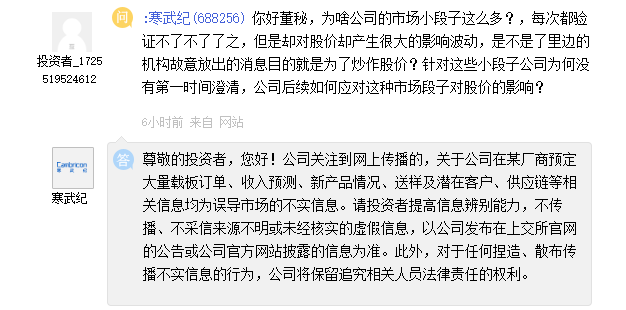 8月12日,有投資者向寒武紀(jì)-U(688256.SH)提問,寒武紀(jì)回答表示,公司關(guān)注到網(wǎng)上傳播的,關(guān)于公司在某廠商預(yù)定大量載板訂單、收入預(yù)測(cè)、新產(chǎn)品情況、送樣及潛在客戶、供應(yīng)鏈等相關(guān)信息均為誤導(dǎo)市場(chǎng)的不實(shí)信息。請(qǐng)投資者提高信息辨別能力,不傳播、不采信來源不明或未經(jīng)核實(shí)的虛假信息,以公司發(fā)布在上交所官網(wǎng)的公告或公司官方網(wǎng)站披露的信息為準(zhǔn)。此外,對(duì)于任何捏造、散布傳播不實(shí)信息的行為,公司將保留追究相關(guān)人員法律責(zé)任的權(quán)利。