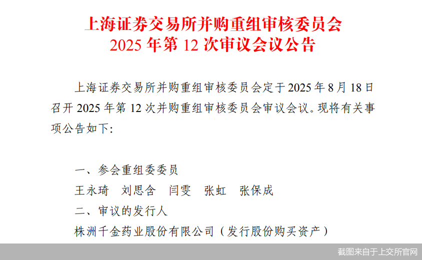 根據(jù)安排,上交所并購重組審核委員會定于8月18日召開2025年第12次并購重組審核委員會審議會議,審議千金藥業(yè)發(fā)行股份購買資產(chǎn)事項。