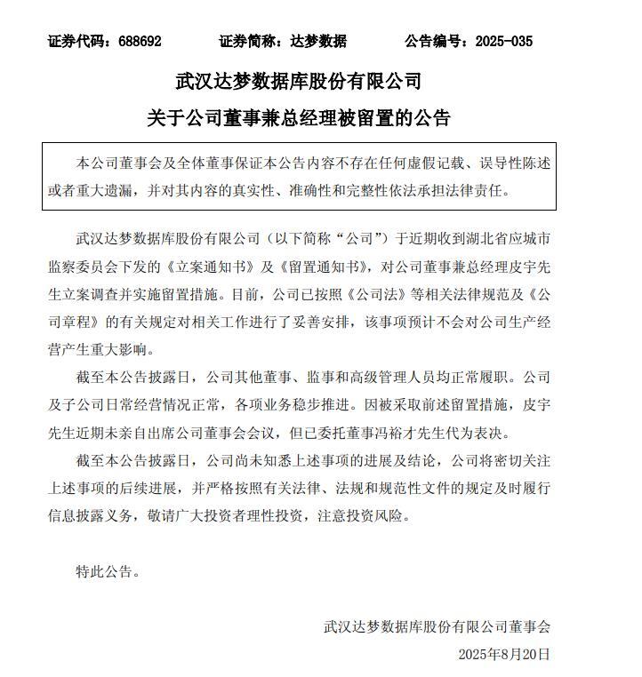 達(dá)夢數(shù)據(jù)19日晚間發(fā)布公告稱,公司于近期收到湖北省應(yīng)城市監(jiān)察委員會下發(fā)的《立案通知書》及《留置通知書》,對公司董事兼總經(jīng)理皮宇先生立案調(diào)查并實施留置措施。目前,公司已按照《公司法》等相關(guān)法律規(guī)范及《公司章程》的有關(guān)規(guī)定對相關(guān)工作進(jìn)行了妥善安排,該事項預(yù)計不會對公司生產(chǎn)經(jīng)營產(chǎn)生重大影響。
