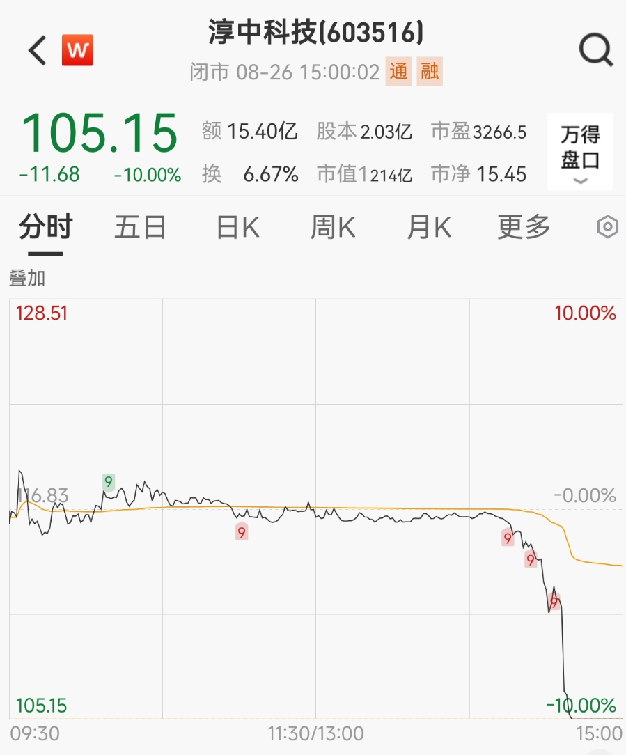 8月26日,淳中科技(603516)(603516.SH)尾盤跳水跌停,報(bào)收于105.15元/股,跌幅10%。截至收盤,換手率6.67%,成交量13.55萬手,成交額15.40億元。