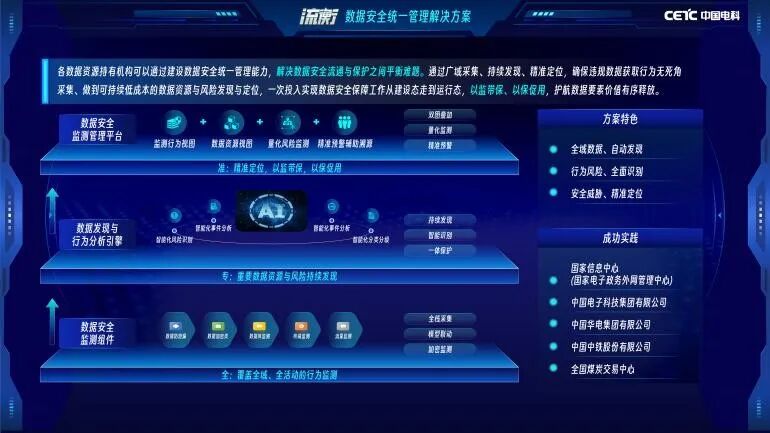 此外,面對數(shù)據(jù)在時空變化下的防護(hù)難題,電科網(wǎng)安“流衡”數(shù)據(jù)安全統(tǒng)一管理解決方案以“精準(zhǔn)定位、以監(jiān)促防、以防促用”為核心理念,為企業(yè)構(gòu)建分層協(xié)同的數(shù)據(jù)安全治理體系。
