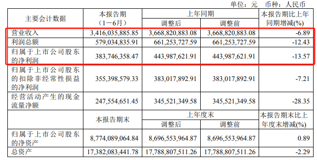 然而,陳德力上任之后的首份半年報顯示,公司營收凈利雙雙下滑。公司實現(xiàn)營業(yè)收入34.16億元,同比下降6.89%;歸母扣非凈利潤為3.55億元,同比下降7.21%。